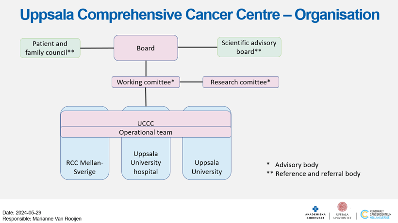 Uppsala Comprehensive Cancer Centre (UCCC) is a formalisation of an already strong collaboration between Uppsala University Hospital, Uppsala University, and the Regional Cancer Centre (RCC Central Sweden Healthcare Region). The centre brings these entities together to operate within an efficient learning organisation, working in a structured, data-driven way with continuous improvements in cancer care, research, and development.