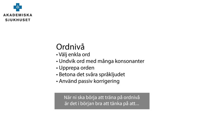 När ni ska börja träna på ordnivå är det i början bra att tänka på att träna på enklare ord, till exempel ord med tre, fyra bokstäver. Försök i början att träna på ord där det svåra språkljudet kommer först i ordet. Fortsätt sen att träna på olika ord där det svåra språkljudet också finns i mitten och i slutet av ord.