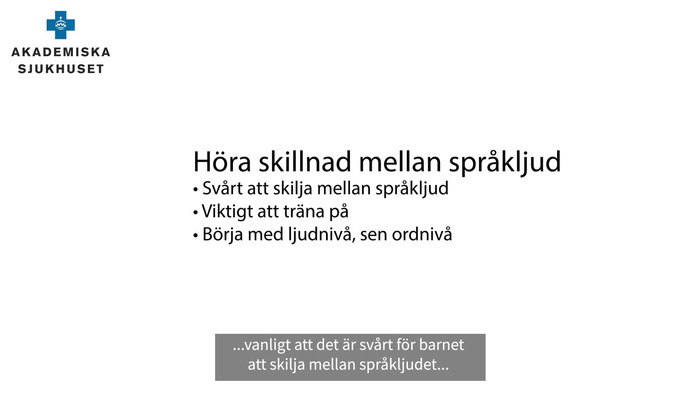 Om barnet har uttalssvårigheter är det vanligt att det är svårt för barnet att skilja mellan språkljudet som är svårt att uttala och det språkljud som barnet ersätter det svåra ljudet med. Exempelvis kan barnet tycka att barnet säger /k/ fast vi hör det som /t/. Eller att barnet tror att barnet säger /s/ fast vi hör det som /t/. Därför är det viktigt att höra skillnad mellan det svåra språkljudet och det ljud som barnet ersätter det svåra språkljudet med. Börja att träna på att höra skillnad på ljudnivå för att sedan fortsätta på ordnivå.