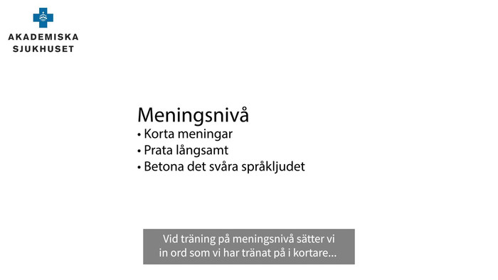 Vid träning på meningsnivå sätter vi in ord som vi tränat på i kortare meningar. När vi tränar med meningar är det viktigt att prata långsamt och att fortsätta betona det svåra språkljudet.