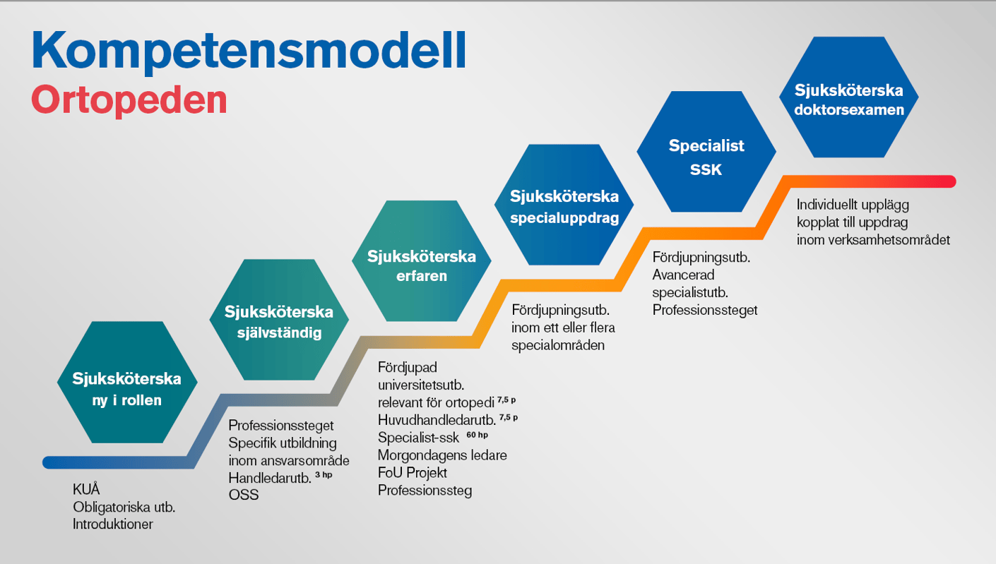 Hos oss får du en bred kunskap om den ortopediska patienten och får fördjupa dina färdigheter i pre- och postoperativ vård. Förutom den ortopediska åkomman har flertalet av våra patienter också andra underliggande sjukdomstillstånd i behov av behandling, såväl kroniska som akuta. Det medför att du får en bred medicinsk kunskap och kan utveckla dina kunskaper för att kunna ta hand om patienter med komplexa vårdbehov.