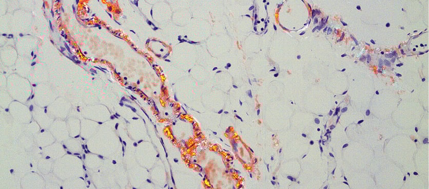 Systemisk amyloidos är ovanliga sjukdomar som beror på felveckade proteiner och ofta påverkar flera organ såsom hjärta och njure. På bilden, som är tagen i mikroskop, syns en amyloid inlagring (rödmarkerat) i vävnad.