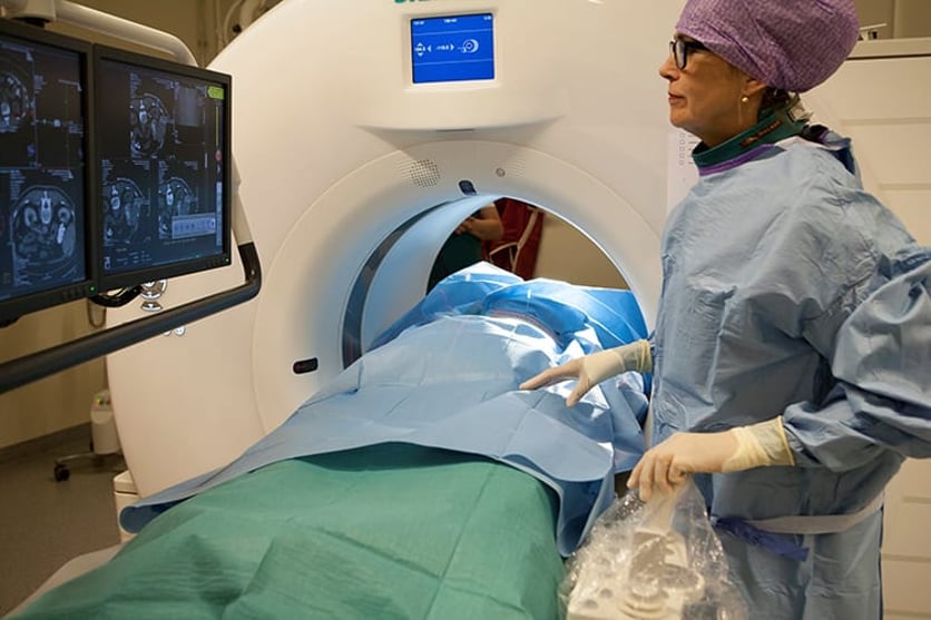 * Vid båda behandlingarna ligger patienten i en datormograf (CT).
