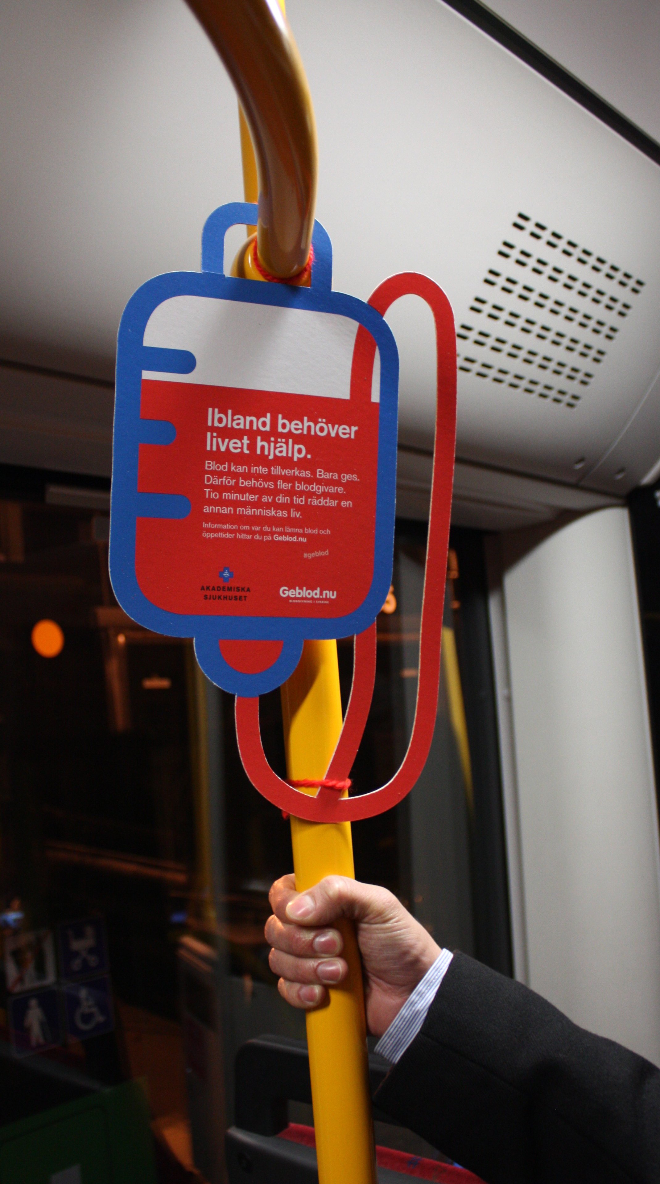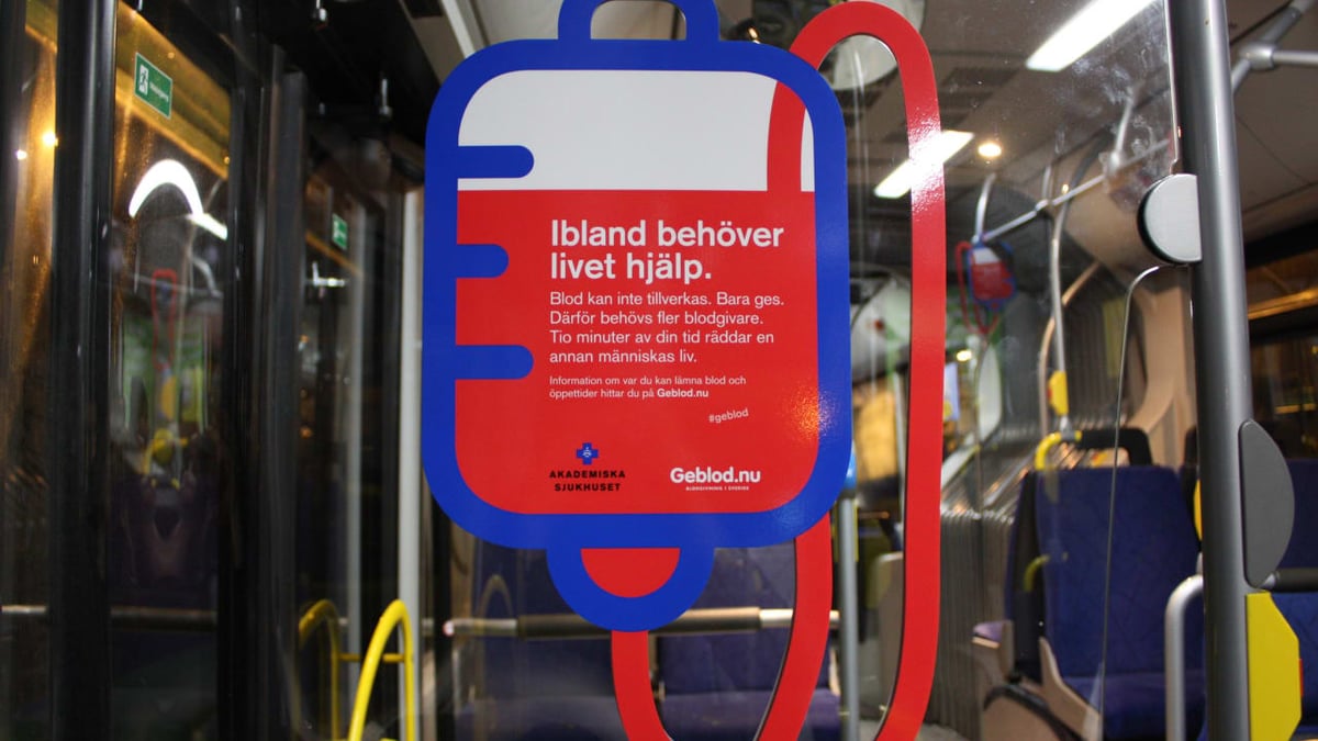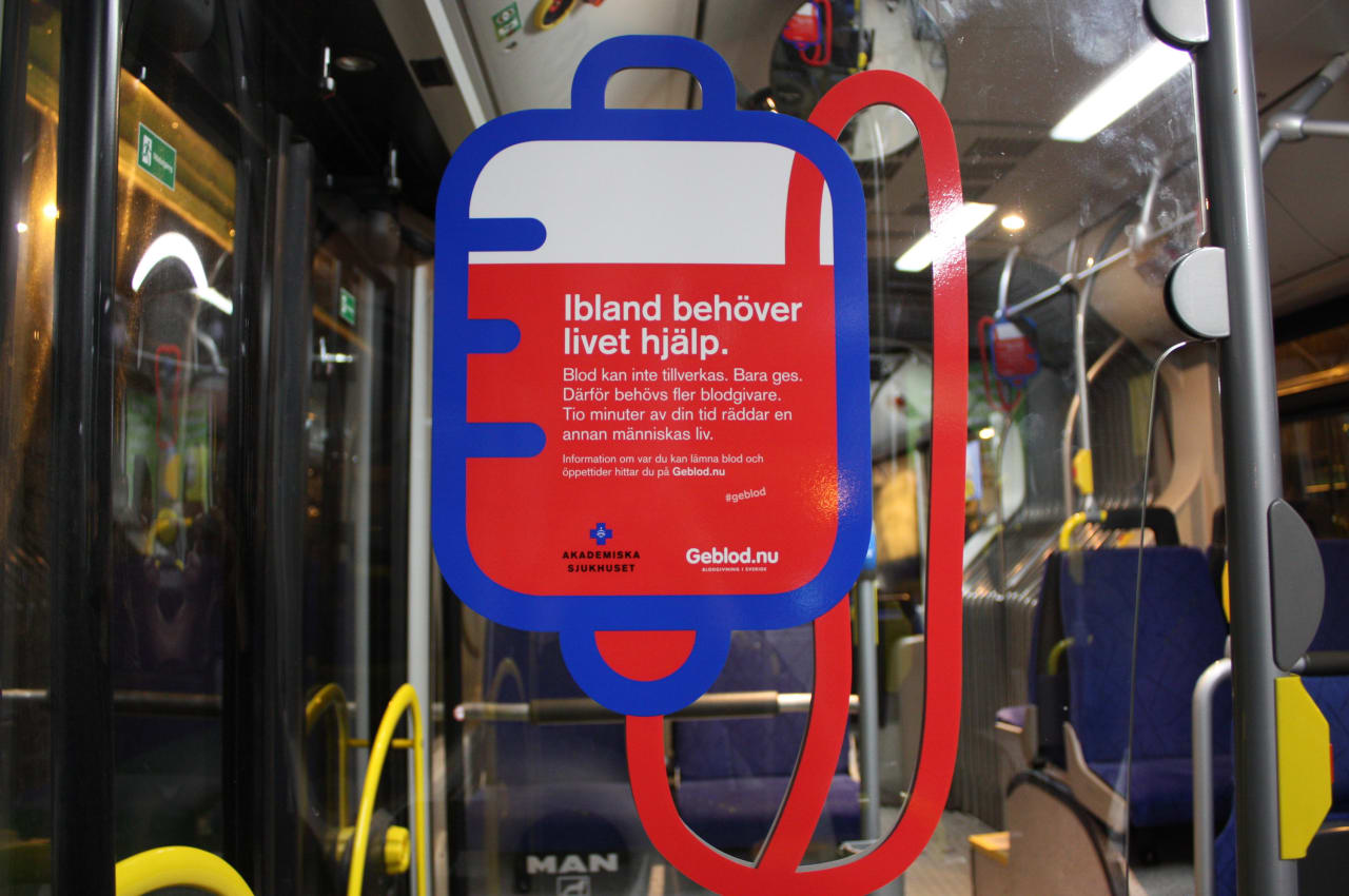Under det senaste året har Blodcentralen på Akademiska sjukhuset vid ett flertal tillfällen haft akut blodbrist. För att minska risken för inställda operationer prövas nu en okonventionell metod som syftar till att rekrytera fler blodgivare i Uppsala. Under ett par dygn – från och med tisdagen den 23 februari – kommer illustrerade blodpåsar att hänga på utvalda stadsbussar och i Friskis & Svettis lokaler.