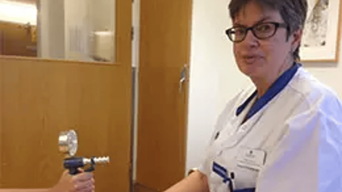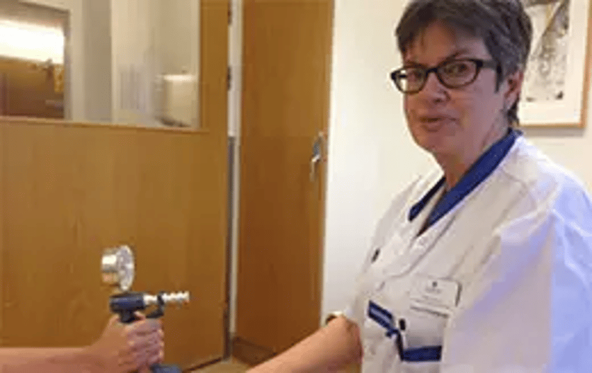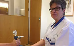 Bildtext: Vid hälsoundersökningen mäter forskningssjuksköterskan Käthe Ström, Minnesmottagningen, bland annat gripstyrka med hjälp av en handdynamometer.