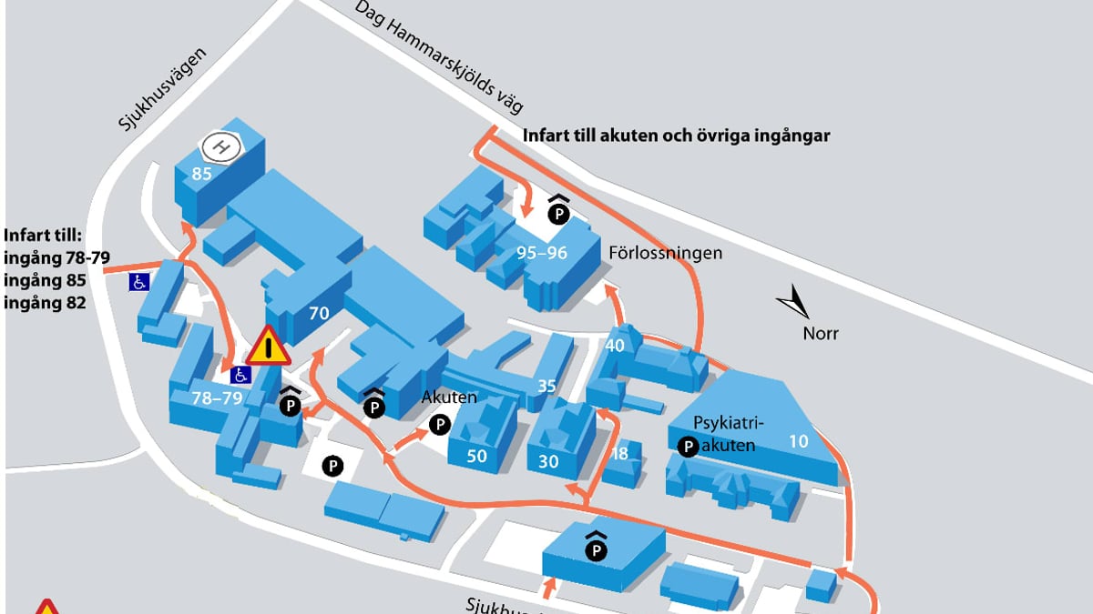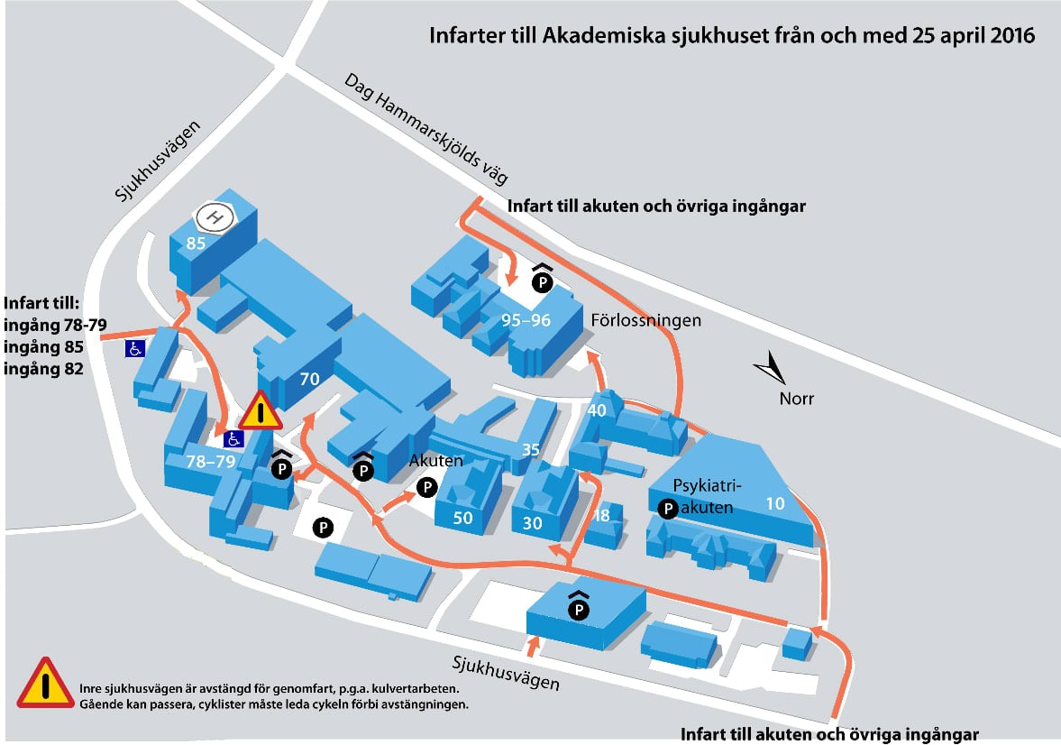 På grund av ett akut behov att täta kulverten utanför 70-huset måste Inre sjukhusvägen stängas av för genomfart med motorfordon den 25 april. Vägavstängningen innebär att vissa ingångar bara går att nå med bil via en infart (se bild). Gående kan passera på trottoaren. Cyklister ska leda sina cyklar. Grävningsarbetet kommer att starta den 25 april. Hela arbetet med renovering av kulverten beräknas vara klart i slutet av sommaren. I samarbete med chefsläkare och vårdhygien vidtas insatser för att förhindra damminträngning på de platser där behov finns.