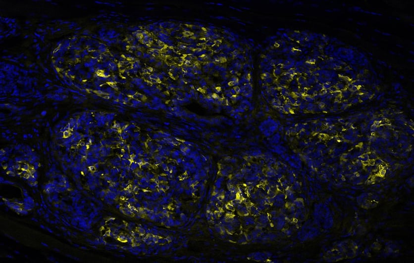 Insulinproducerande celler framodlade ur stamceller, experimentellt transplanterade till en muskel. Insulin ses i gult och cellkärnor i blått.
