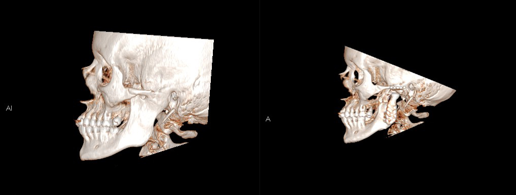 Tack vare en käkledsprotes har en patients gapförmåga ökat från 0 till 30 mm. Bilderna är tagna med datortomografi (DT), den till höger togs 4 år efter operationen. Eftersom materialet polyeten inte är röntgenkontrasterande syns inte ledpannan. I underkäken syns så kallade metallartefakter (effekter av mindre störningar från metall) utanpå delen som sitter på underkäken.