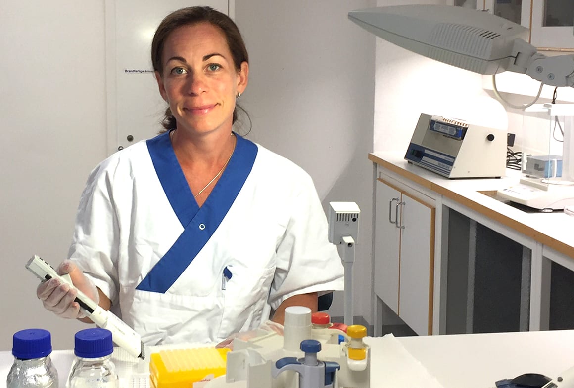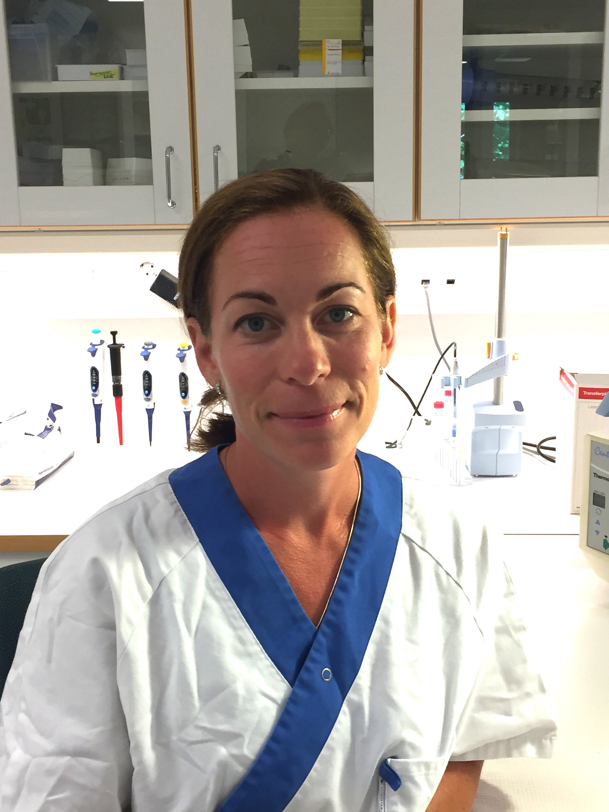 Susanne Victor, biokemist, i labbet på arbets- och miljömedicin, där analyser görs av allergener från kvalster och pälsdjur.