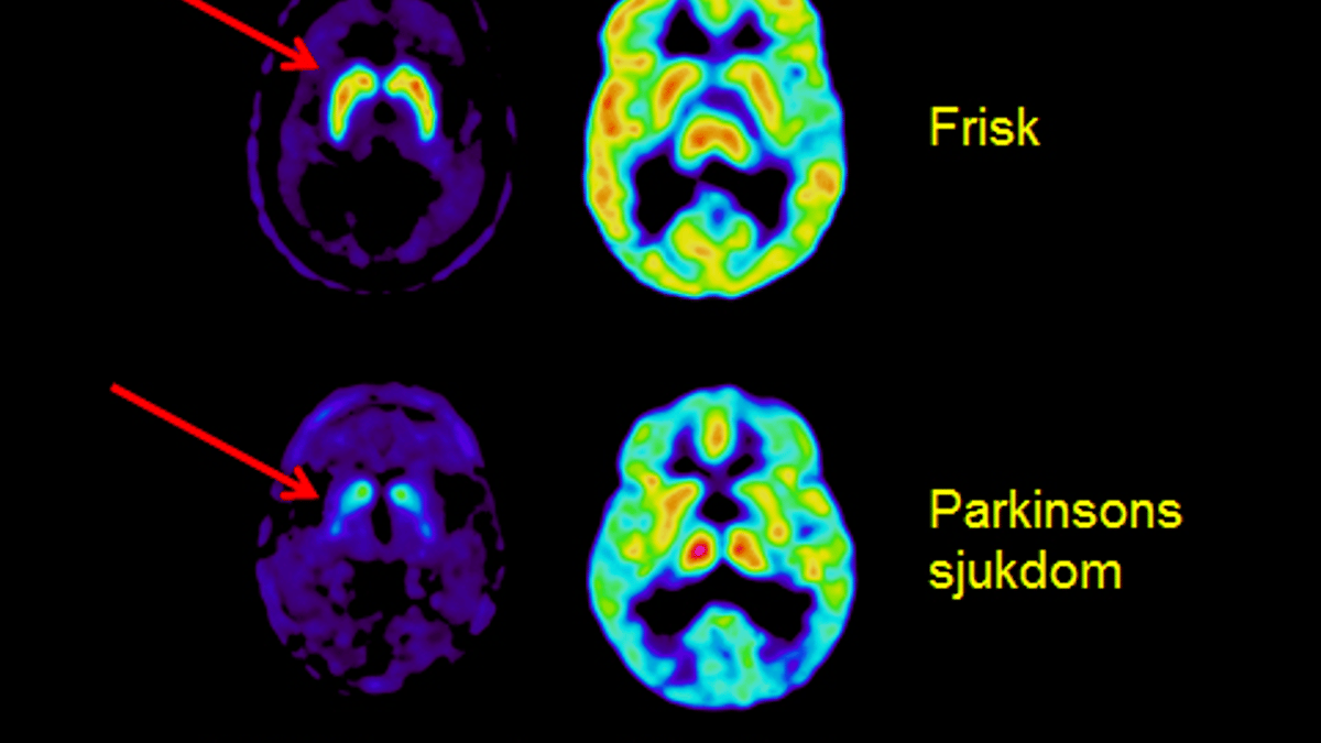 Bildtext: PET/CT-bilden visar att flödesmönstret är förändrat och dopaminivån lägre vid Parkinsons sjukdom.