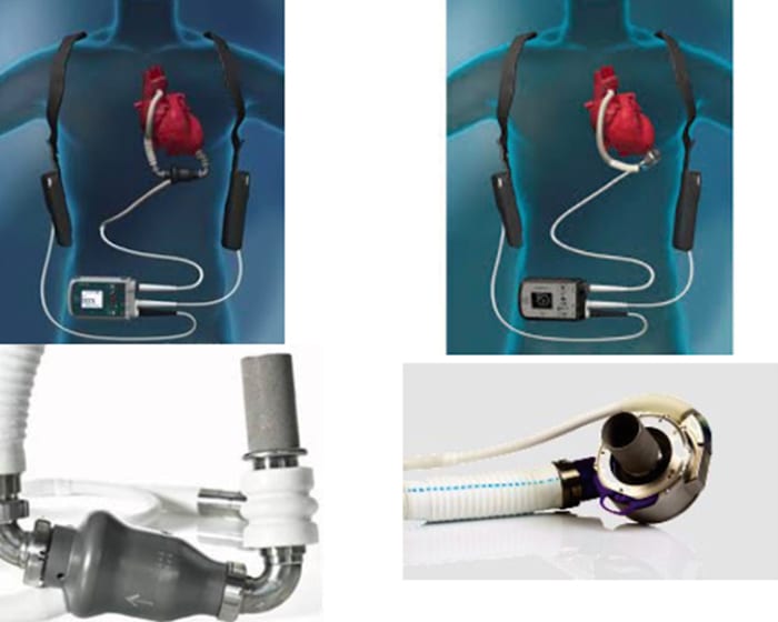 På Akademiska sjukhuset används två typer av batteridrivna hjärtpumpar, så kallade Left Ventricular Assist Devices (LVADs). Den senaste generationens pump (höger) är så liten att den ryms i hjärtsäcken.