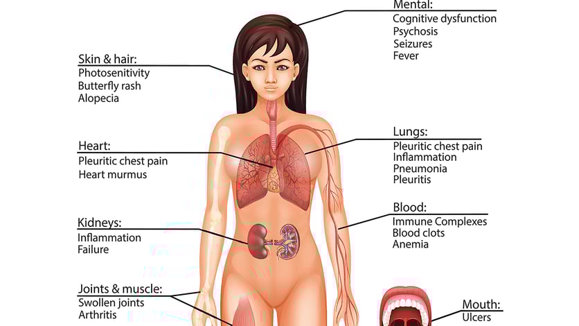 SLE är en autoimmun, reumatologisk sjukdom som leder till smärta och ledinflammation i flera organ och vävnader. Orsaken är att immunförsvaret angriper den egna kroppen. Nu finns en ny antikroppsbehandling som hämmar immunreaktionen. Illustration: Mostphotos