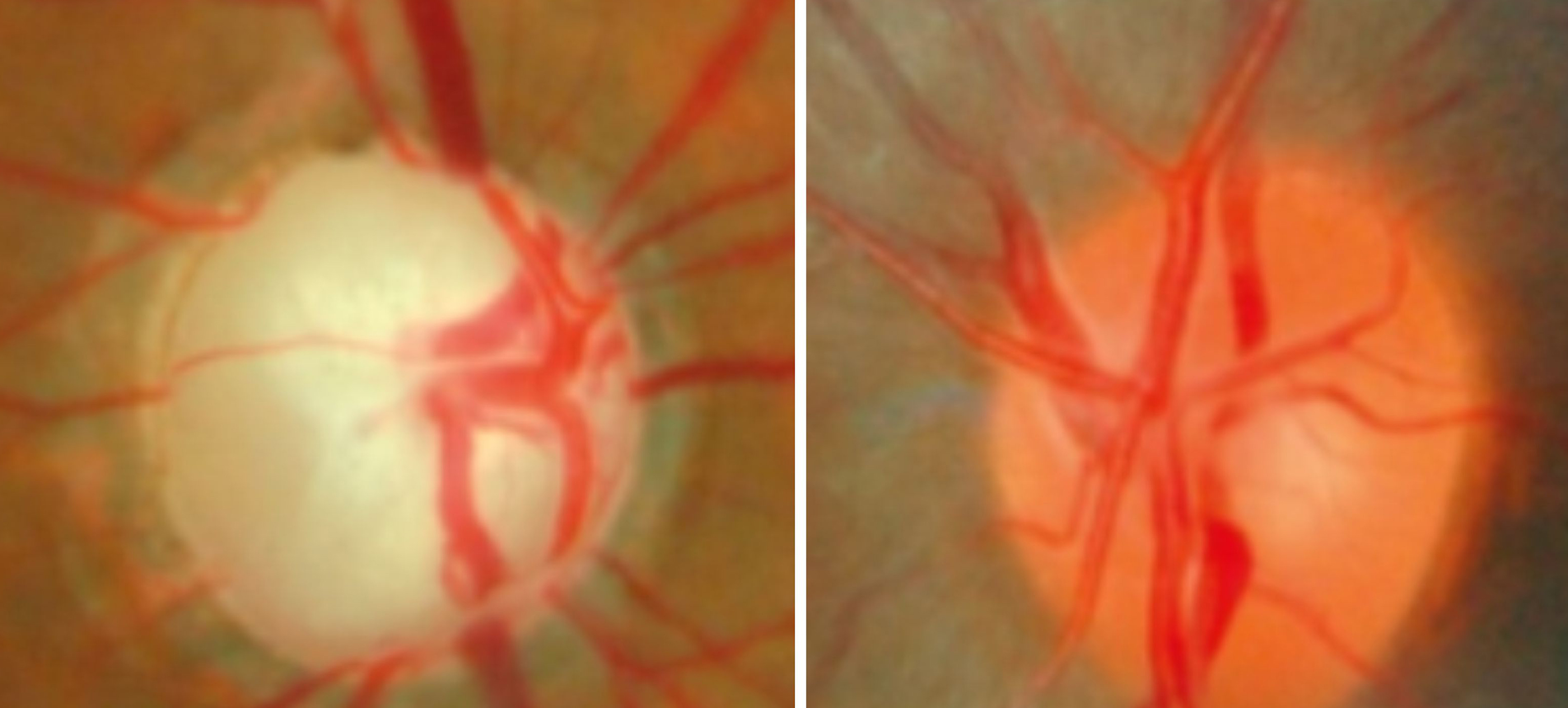 Till vänster: Höger synnerv i öga hos patient med glaukom. Till höger: Vänster synnerv i normalt öga. Den gulbleka färgen i höger öga beror på att nerver som överför information från ögat till hjärnan saknas. Foto: Akademiska sjukhuset