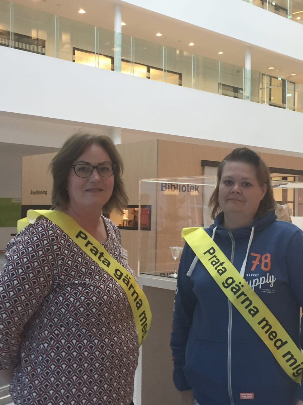 Sedan början av september kan patienter och anhöriga inom psykiatrin tycka till om vården på plats. Anna-Maria Lundberg och Eleonor Belin, båda från Forum för Brukarinflytande, tar in synpunkter. Foto: Elisabeth Tysk