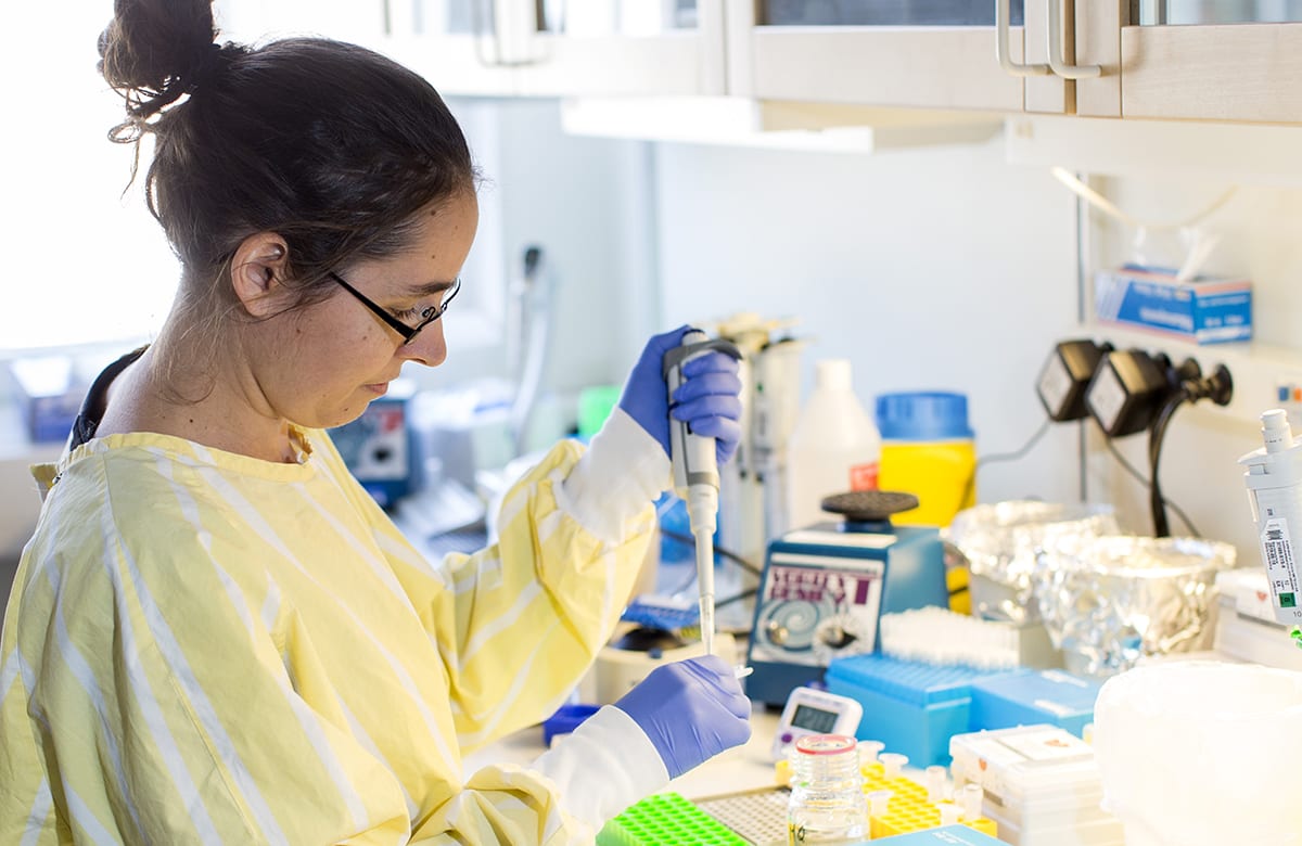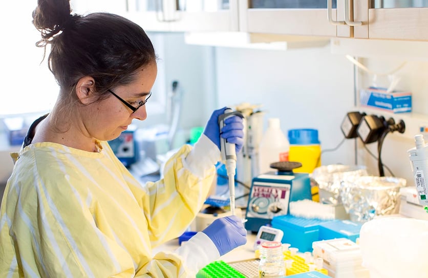 Molekylärbiologen Lotte Moens hanterar prover inför en genanalys (NGS-analys) som görs rutinmässigt vid bröstcancer för att diagnostik och behandling ska bli mer träffsäkra.