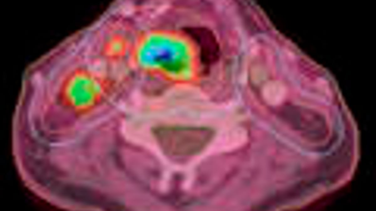 Väntetiden till behandling vid huvud-halscancer har halverats på Akademiska sjukhuset sedan 2009. Detta tack vare ny bilddiagnostik och annorlunda rutiner. För två år sedan började man undersöka patienterna med PET-CT, en teknik där molekylär avbildning kombineras med datortomografi, så kallad skiktröntgen. En följd av detta är att antalet undersökningar kan minimeras. Numera slipper patienten göra separat lungröntgen som normalt görs för att leta efter spridning till lungorna. Man behöver inte heller göra en separat CT-undersökning inför dosplanering av strålbehandling. – Den nya tekniken ger oss en mer precis bild av det område som ska strålbehandlas. En annan fördel är att vi lättare kan spara frisk vävnad, vilket minskar risken för biverkningar, säger Silvia Johansson, överläkare på onkologen. I samband med att den nya bilddiagnostiken introducerades infördes striktare rutiner för när undersökningarna ska göras. Fram till årsskiftet hade 34 patienter undersökts enligt den nya modellen och väntetiden till behandling halverats, från cirka 50 till 25 dagar. Enligt Silvia Johansson har oron minskat hos patienterna, som tydligare får veta hur och när undersökning kommer att ske. Kortare väntetid för behandling gör också att chanserna förbättras att hinna behandla tumören innan den vuxit till sig, vilket kan innebära förbättrad överlevnaden. I vården av patienterna samarbetar specialister från 12 områden, från bland annat öronkliniken, strålbehandlingen, sjukhustandvården och nuklearmedicin. Bilden ovan visar en halstumör (det stora blågröna området i mitten) och två lymfkörtelmetastaser. Tack vare PET får man även biologisk information vilket är viktigt både vid diagnostik och dosplanering.