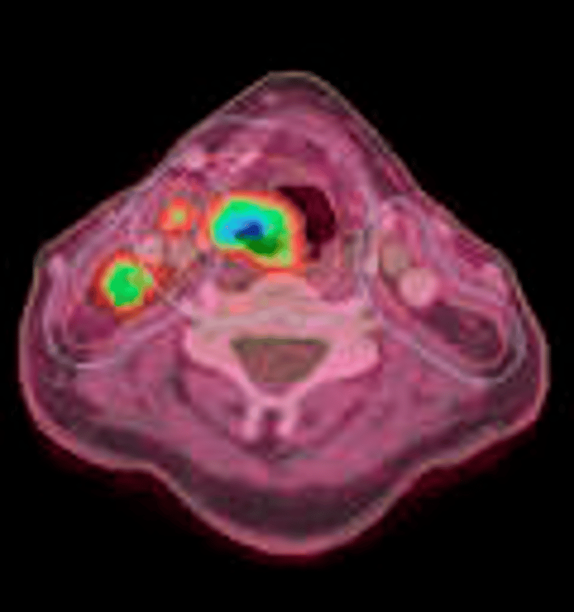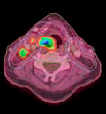 Bilden ovan visar en halstumör (det stora blågröna området i mitten) och två lymfkörtelmetastaser. Tack vare PET får man även biologisk information vilket är viktigt både vid diagnostik och dosplanering.